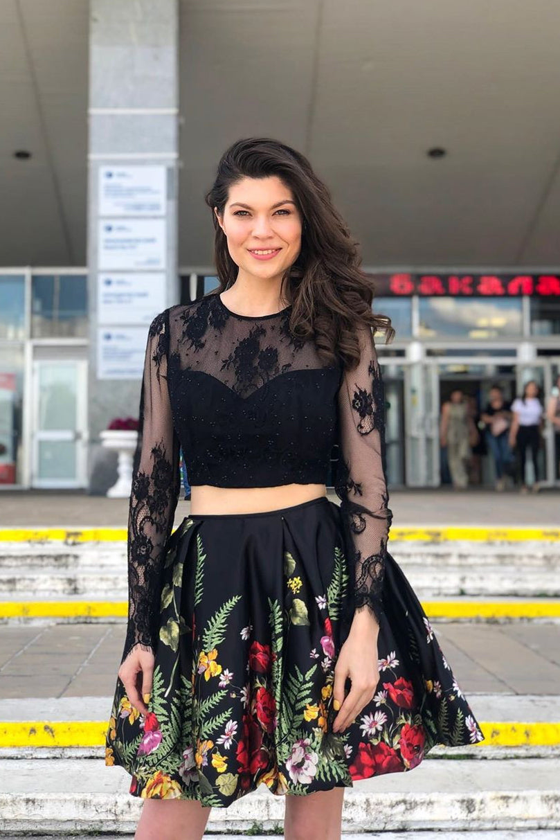 Lace Long Sleeve Jewel Black Homecoming Dress Two Pieces Short Prom Dress OM520
